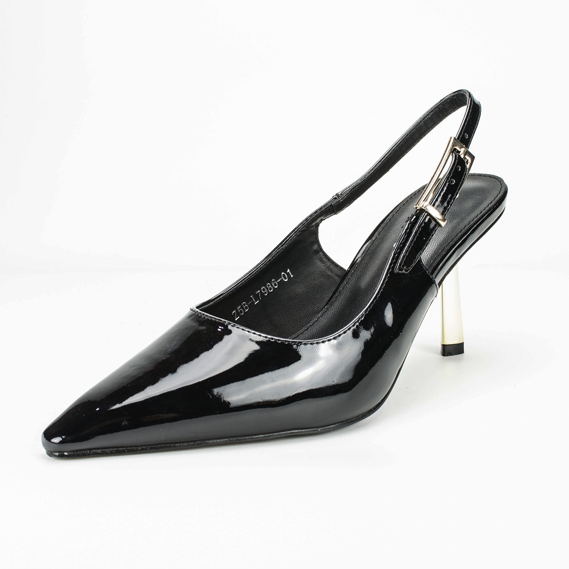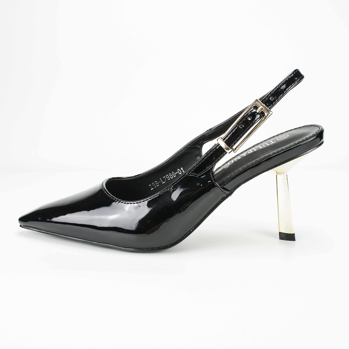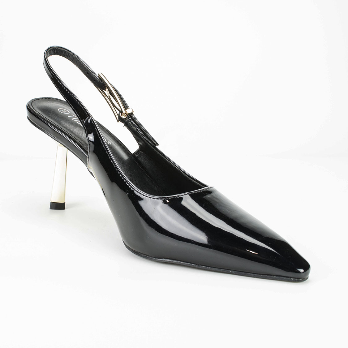Μαύρες Γόβες Open Heel Λουστρίν με Χρυσό Τακούνι