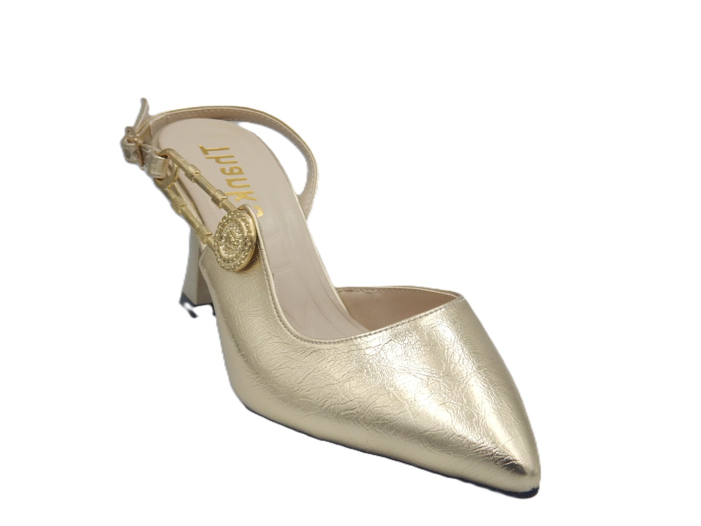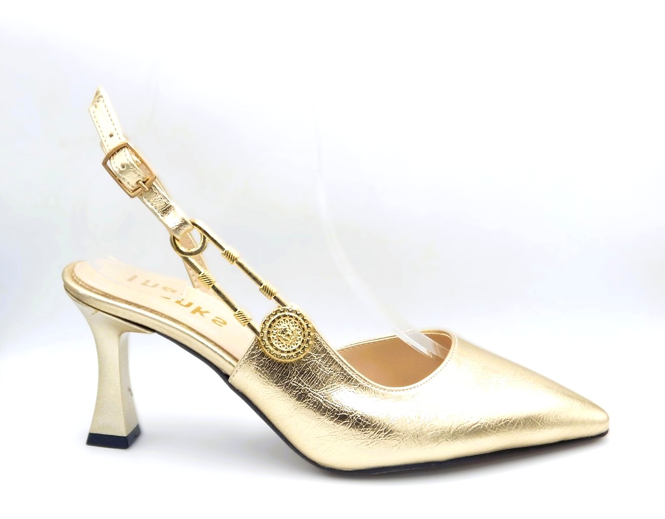 Γυναικείες γόβες slingback της συλλογής Άνοιξη – Καλοκαίρι 2026 σε χρυσό χρώμα με χρυσή μεταλλική λεπτομέρεια. Το κομψό τακούνι και η προσεγμένη κατασκευή εξασφαλίζουν άνεση και σταθερότητα. Ύψος τακουνιού 5,5εκ.