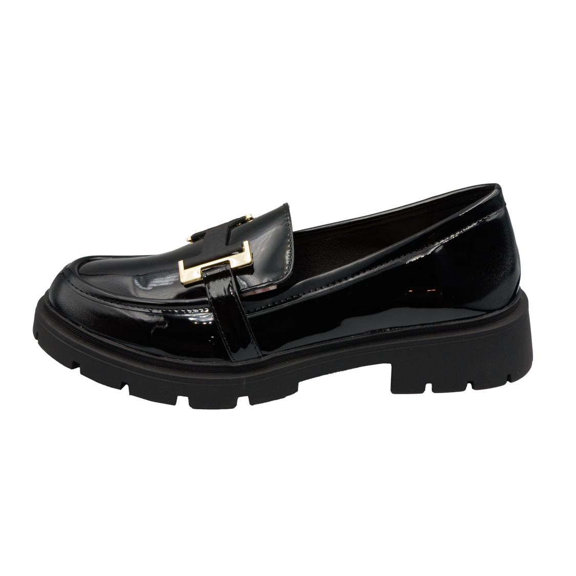 Μαύρα λουστρίνι loafers με χρυσή αγκράφα και τρακτερωτή σόλα
