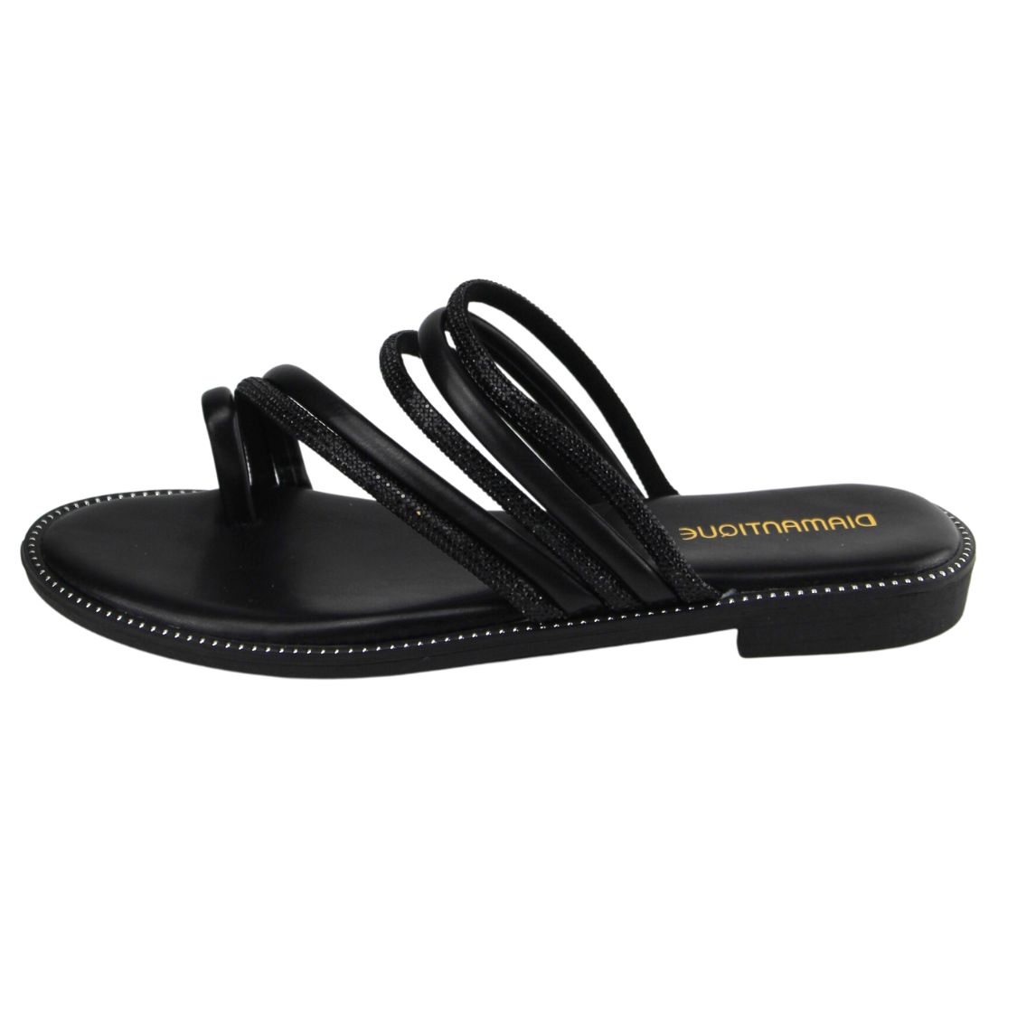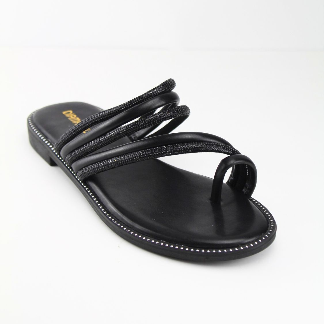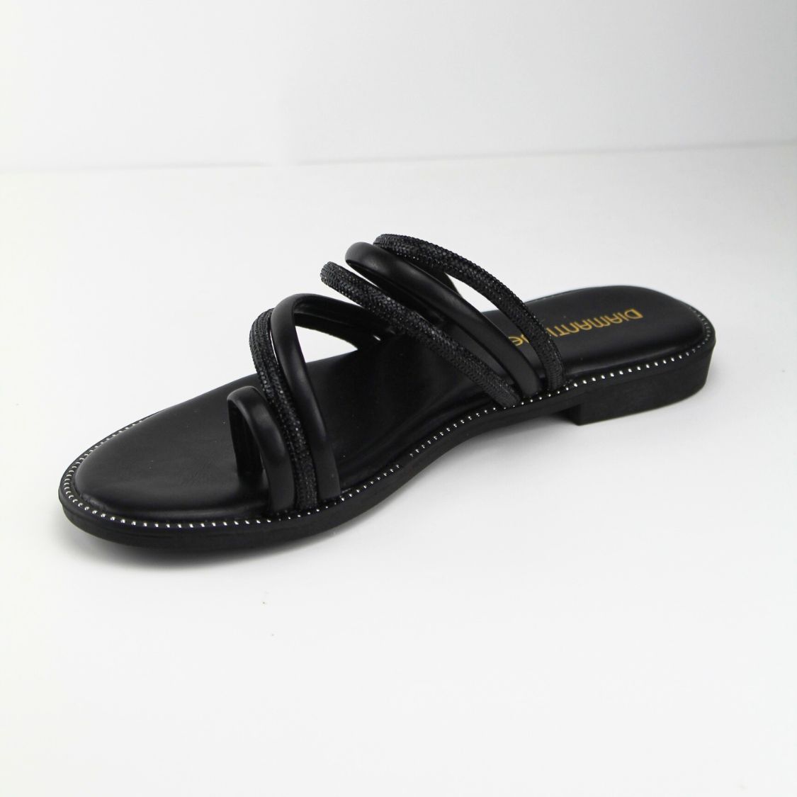 Σανδάλια δερματίνη σε μαύρο χρώμα. Πολλαπλά λουράκια από δερματίνη και στρας και σχέδιο δαχτυλίδι.