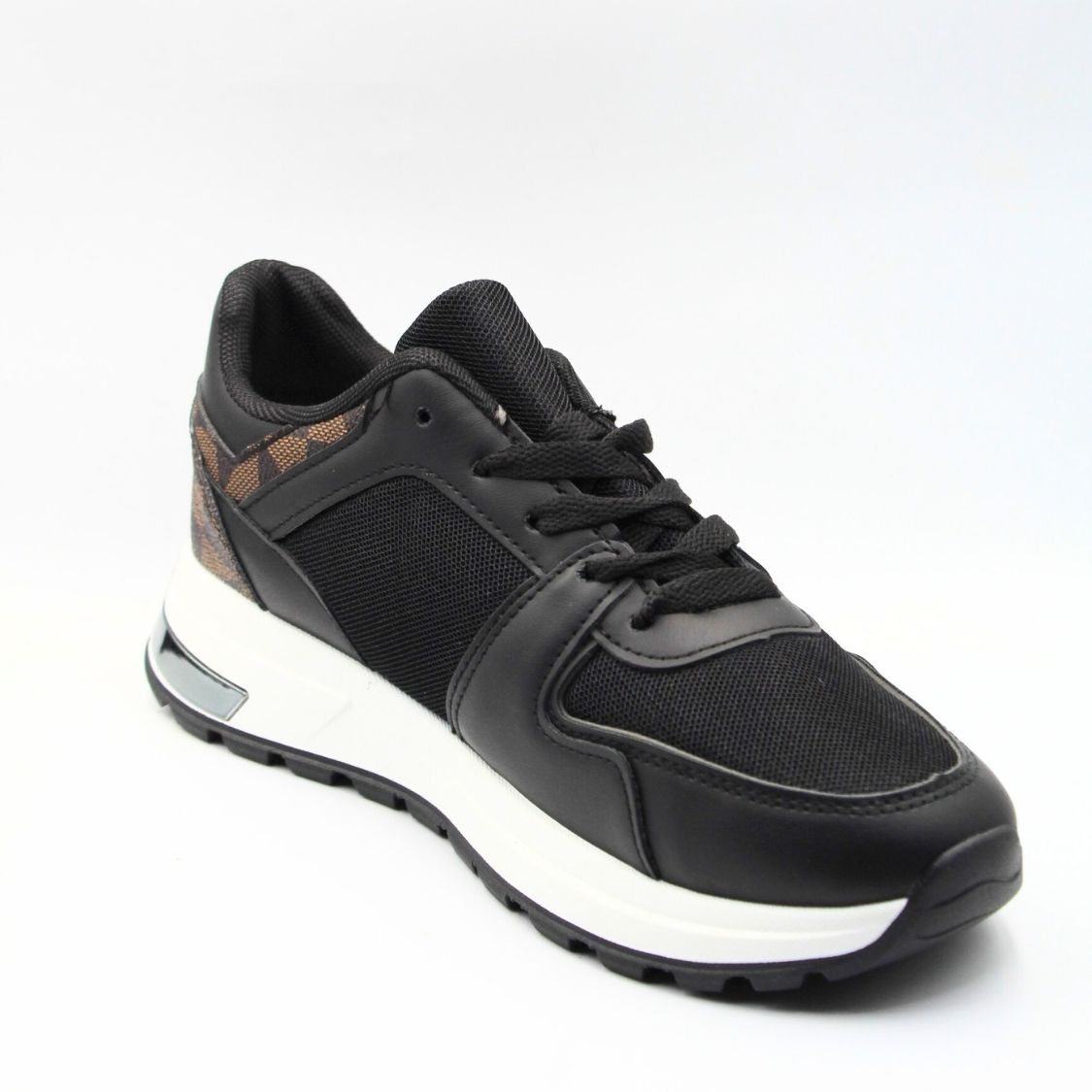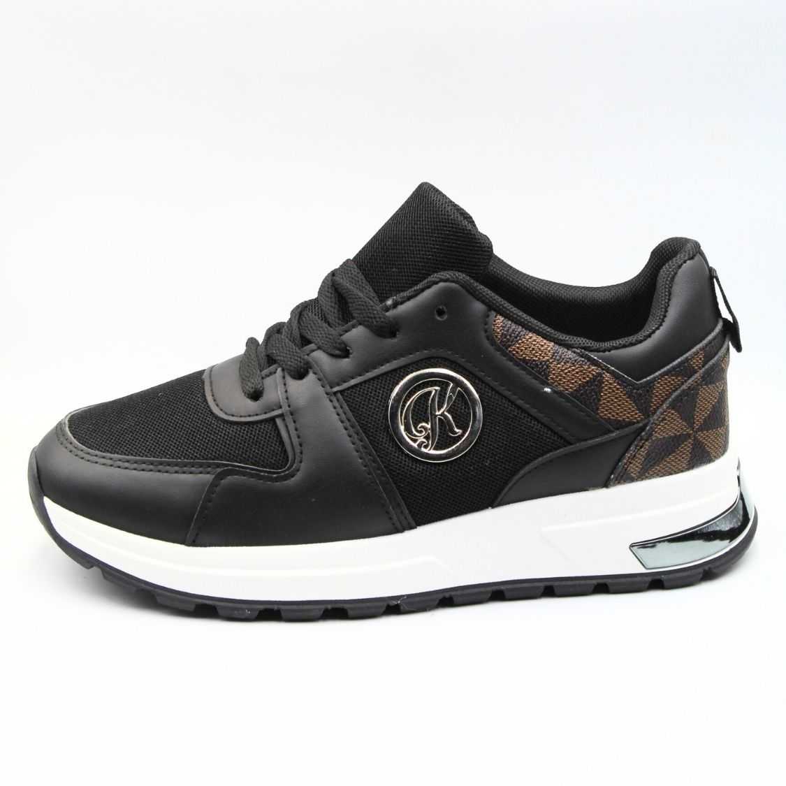 Sneakers μαύρο με ασημένιες λεπτομέρειες, Sneakers με μεταλλική λεπτομέρεια στο πλάι και ιδιαίτερο σχέδιο πίσω. Είναι κατασκευασμένα από συνδυασμό υφάσματός και δερματίνης ενώ διαθέτουν ελαστική αντιολισθητική σόλα.